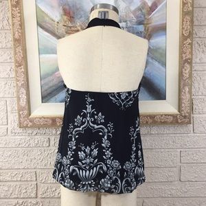 Cute lined bubble hem halter style top in a silky floral print design fabric with elastic across back. 100% Polyester. 100% Polyester Lining. Hand Wash. Flat Lay Measurements: Center length length is approx 25”. Armpit to armpit is 18”.