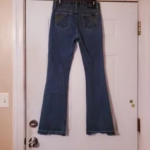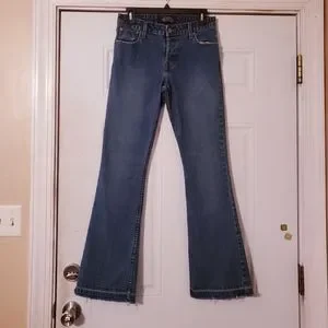 Euc, Levi Strauss juniors 7 medium wash low rise flare jeans. 3 button fly. Has some fabric runs, bottom are fringed with thread stragglers/frizz. Old school high Quality jeans. Worn 2-3 times