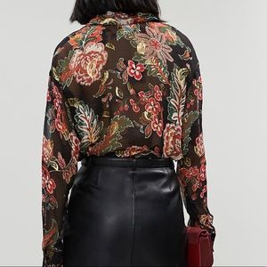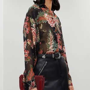 Collar, long sleeves, buttoned cuffs, all-over metallic floral print, semi-sheer, curved hem