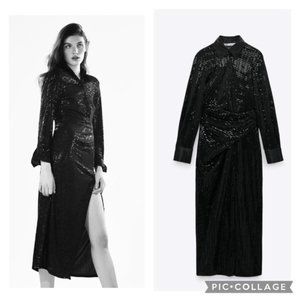 Zara Sexy Black Sparkly Sequin Shirt Midi Dress