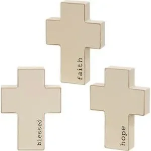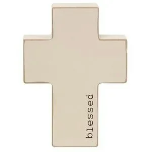 Perfect everyday display, the cross-shaped wooden block has a creamy ivory finish with lightly distressed edges. It is printed with either the word, “Hope,” “Faith,” or “Blessed” in a simple black typeface. Measures 6” high by 4.25” wide by 1” deep.