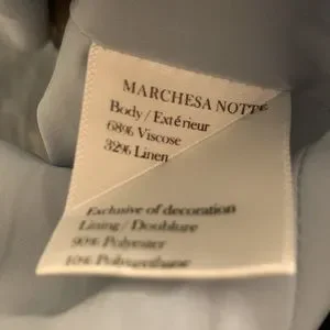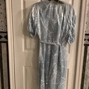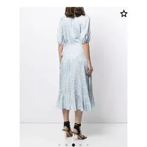 New with tag. Powder Blue. Embrace Marchesa Notte's elegant designs. Featuring short puff sleeves, this dress features a foliage print that will add a botanical twist to your ensemble. Picking a dress has never been this easy. Highlights. Powder blue. Foliage Pattern. V-neck. Shirt puff sleeves. Wrap design. Side tie fastening. Ruffle hem. Imported.