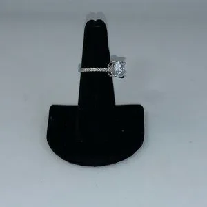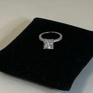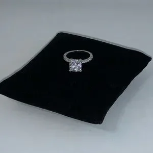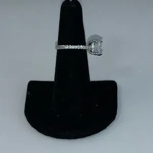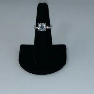 The scintillating 1 carat cushion cut center diamond simulant stone is held in four claws which is accented with brilliantly.