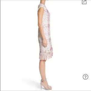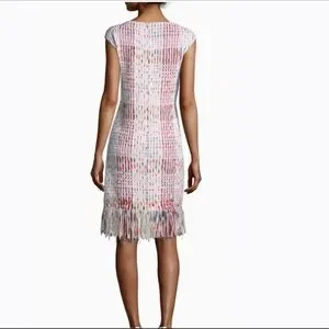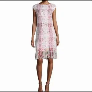 St John dress, soft ribbon micro plaid. Elegant with fringe trim, cap sleeves, hidden back zipper, bateau neckline and shift silhouette. This is one to style.