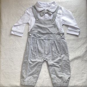 Two piece tuxedo with overalls, bowtie & snap bottom closure