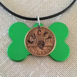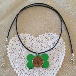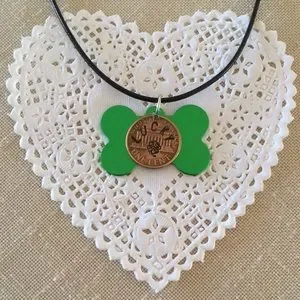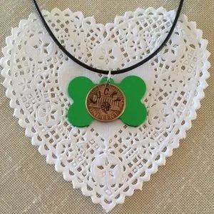 LUCKY Dog Bone Necklace Green Color Handcrafted Artisan Stamped Shamrock Penny