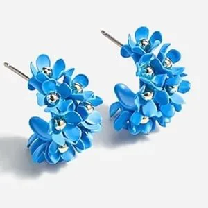 J Crew Soft Bouquet Earrings, NWT, Island Turquoise, Lightweight, Powder Coated Fabric Flowers with Tiny Gold Beads at the Center