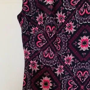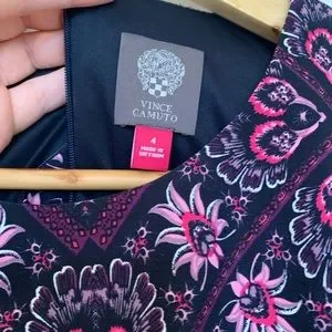 Very gently used size 4 Vince Camuto dress. Body hugging but not skin tight. Perfect for the office or a professional occasion. Floral and pattern are purple/ pinkish with black and white. Sure to catch anyone’s eye