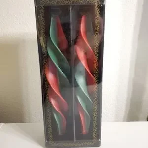 1 Pair Of Christmas 12 Inch Red And Green Wax Candles Feather Twist Taper Unused