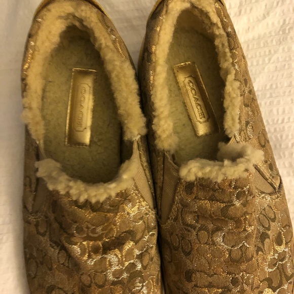 Coach fur-lined deck shoes 8B pretty gold & silver Cs.