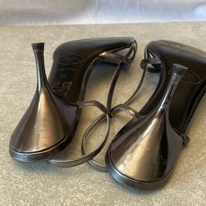 Strappy heels in gunmetal grey/dark silver color. See pics for various scuff marks/sign of wear. Left heel with defect, see pic. Heel approx 3.25”. Per Prada size guide, 39 is US size 9. Price firm.
