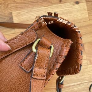 Sole Society cognac crossbody purse with perforated design on front & flap