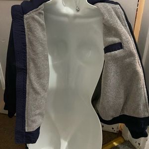 Great jacket for spring time/fall. Zip up jacket has two outside zip pockets, and one inside pocket. Fully lined.