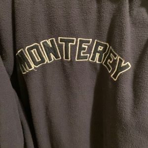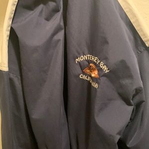 Jacket is used but is still wearable. It flips inside out as well which has a dark blue color with the word Monterey. It has a detachable hoodie and keeps you very warm as well as adjustable wrist straps. The only flaw is the jaw strings on the inside to adjust the waist of the jacket, which are kind of ripped but it isn’t noticeable when being worn.