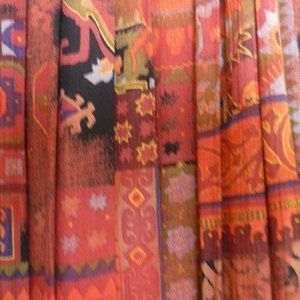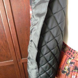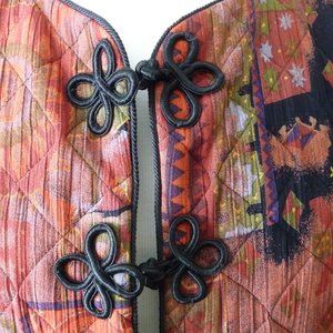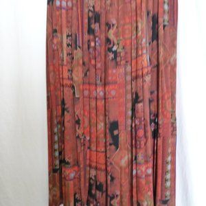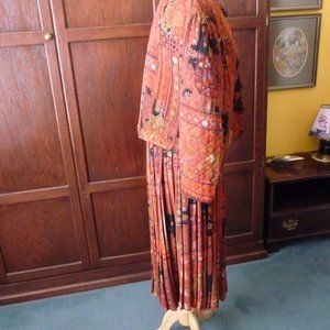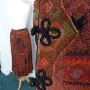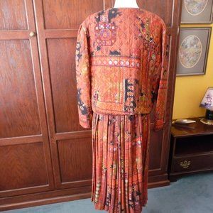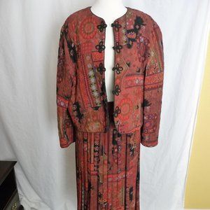 Rich burnt umber color with black piping and feature toggles. Quilted unlined bolero jacket and all around pleated skirt with elasticated waist. Size 20W. Jacket shoulder 17, bust 42, length 21.5, sleeves 24ins. Skirt elasticated waist 36, hips 46, length 33.5ins. Dry clean to preserve pleats. Rayon, made in USA, 1990'S.