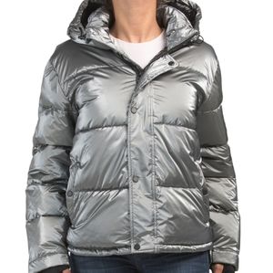 Ultimate outdoor puffer jacket topped with a stand-up collar and hood. Crafted with front snap buttons and snap pockets.