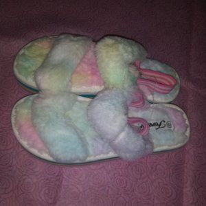 Brand new,never used. Pastel rainbow faux fur platform sandals. Feature soft pastel pink, blue, purple, green, & yellow faux fur, pink & white stripped strap, and blue,yellow,pink, & white striped platform. Comfortable. Similar color to the ones worn by model except platform bottom is white with rainbow stripes and it is 2 bands across the top, not one. In good condition. Come from a pet-free/smoke-free home.