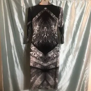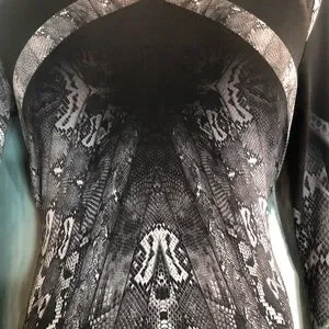 Although this dress speaks for itself, take a moment to admire the exquisite snake print, and how it contours and accentuates the natural curves of the body. This designer dress is a fitted poly-spandex blend with scoop neck, and has the same print on the back. Got from board room to date night with a few accessories; this dress is perfect for any occasion. Unlined and very light weight. Never worn and flawless, but does not have original retail tags attached. Marked XS, but due to the stretch, looks just as flattering on a 2 as an 8. 🔻Length 37”🔻Sleeves 17”🔻pit to pit flat 16”🔻Waist flat 14”