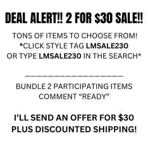 DEAL ALERT! Check out this awesome SALE! BUNDLE THIS ITEM WITH ANOTHER 2/$30 ITEM IN MY CLOSET, COMMENT "READY" AND I'LL SEND $30 OFFER WITH DISCOUNTED SHIPPING! There are hundreds of participating items to choose from. To find these items, type LMSALE230 in the search bar on Poshmark or click the LMSALE230 style tag on this listing!