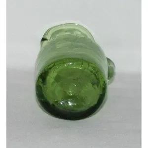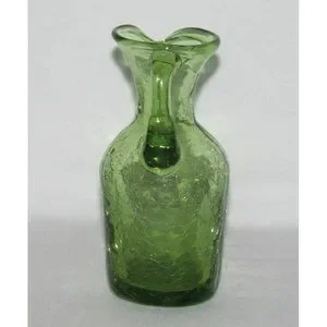 This is a nice olive green small miniature pitcher in the Crackle pattern. It was probably made by the Jamestown Glass Co. It measures 4 3/4 inches tall and 1 7/8 inches across the top. It has a smooth pontil.