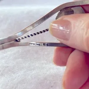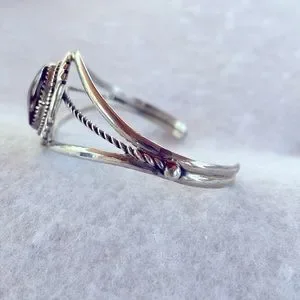 Beautiful deep brown jasper oval set in an ornate sterling silver cuff bracelet. It looks black in the photos, but it’s a rich brown color. Fits 6”-7” wrist. Stamped “sterling” and with the Navajo artisan’s mark. New.
