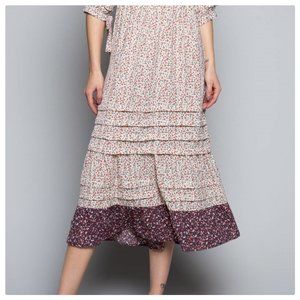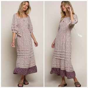 POL's fresh of joy Ditsy Floral Printed Maxi Dress is Designed in a relaxed fit with a squarish round neckline. Features mixtures of Fabric with Floral prints, balloon sleeves with pleated detail and a band of self ties on the side. Also has pleated detail on bottom, an open back with Fringe Tassel Closure, Adjustable String Fringe Tassel for hold, and finished with Ruffle layers on bottom Hem.
