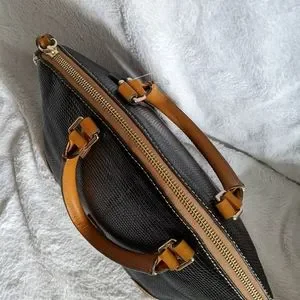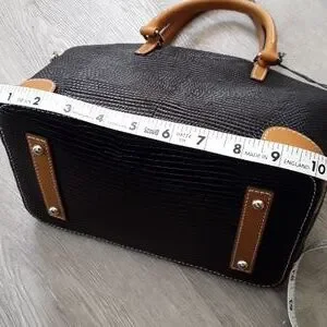 Chic styled dome pebbled leather bicolor bag, black with tan contrasting leather, top tassled zip, front gold logo plaque, satchel handles and adjustable crossbody strap, red fabric interior, grosgrain ribbon key fob attachment, 4 interior pockets, protective feet. Dustbag included. NWT. Measurements are approximate...please ask if there are questions!
