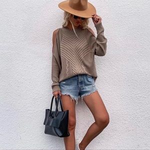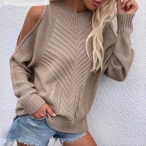 Dune Taupe Cable Knit Open Shoulder Boho Sweater Top In The Relaxed Fit