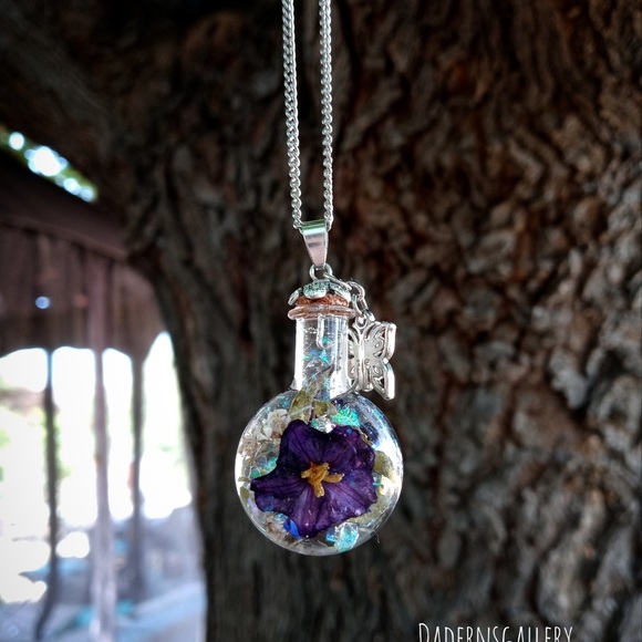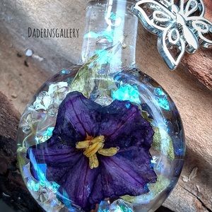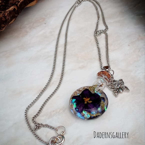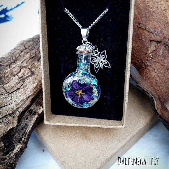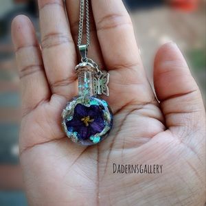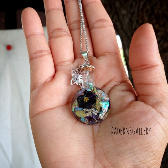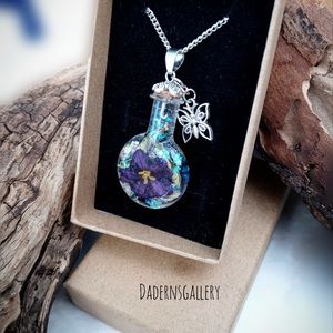 Handmade terrarium necklace was made with love. Selected fresh flower and air dried to retain its natural color, then sealed with Resin in a magical small bottle. A Perfect gift for loved ones who love the beauty and magic of the nature.accentuate with a long silver tone chain and butterfly charm. Will be delivered to you in a small brown jewelry box.