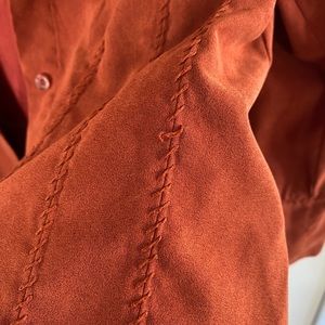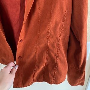 Size M burnt orange color, suede like material button up with a collar. The buttons match the color of the fabric, and there’s a super cool stitching pattern on the front and on the ends of the sleeves. The only imperfection is one of these stitches on the front left side came slightly loose (as seen in picture 4), but it is not noticeable at all when worn. Has a stunning satin like material on the inside. Can fit XS-M depending on how loose/fitted you like your button ups