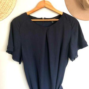 Banana Republic navy dress. Pleated neckline. Scoop neck. Fabric belt. Zip back. 100% polyester lining & shell. No rips, stains or holes. Size L, TTS.