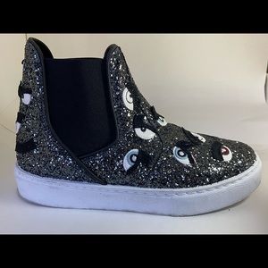 Charcoal glitter high slip-ons featuring patent leather and suede embroideries. Elastic panels on sides. Contrasting black edges. Black leather lining and insole. White rubber sole.
