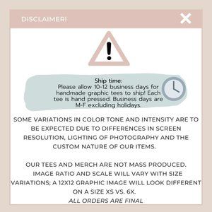 MADE TO ORDER! Please allow 10-12 business days for this collection of our handmade graphic tees to ship! Each tee is hand pressed. Business days are M-F excluding holidays. As this is a made to order item, all sales are final. Some variations to color tone/intensity to be expected depending on graphic process (sublimation vs. screen print). We cannot rush orders or provide shipping updates (we state our turnaround times for a reason) please be patient, these aren’t mass produced!