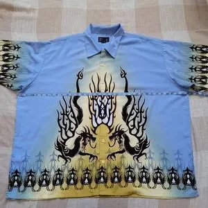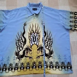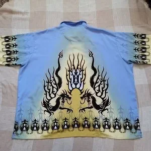 y2k Blue and yellow button down collared polo/Hawaiian shirt with dragon and flames on it.