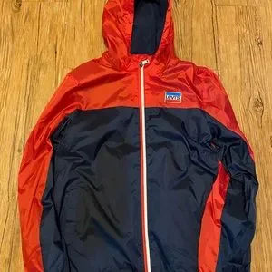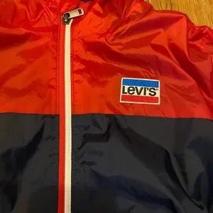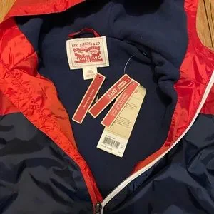 Levi Strauss & Co boys hooded jacket in red/navy blue size Large boys. Zippered front, front pockets, water resistant, insulated to maintain heat. Ready to wear anytime 😁 Levi logo on front left chest. Literally brand new I just accidentally threw it in the wash with a load of clothes 🤦🏻♀️