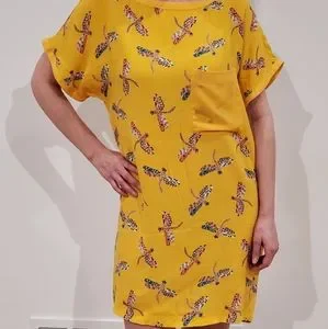 This dress is about 18 years old. So comfy for summer days. Good condition! Looks great with a belt too! I love the dragonflies on it!