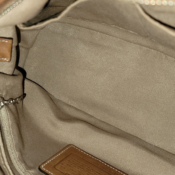 Coach mini-C signature jacquard with camel leather trim, F10418. Extremely clean and in excellent condition with small mark on bottom, pic 4. Interior zip pocket and two open pockets plus key clip. Leather tassel (removable) zip pull and silver Coach hang tag. About 12" wide, 8" tall , 4" deep. Adjustable shoulder strap. Great gift. Smoke-free home.