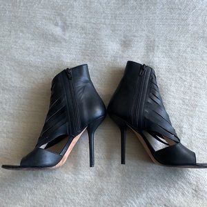 Black leather heels work beautiful woven front.