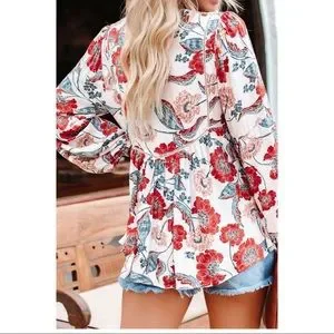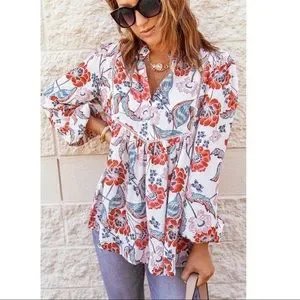 Red Split Neck Bubble Sleeve Floral Patchwork Blouse
