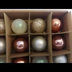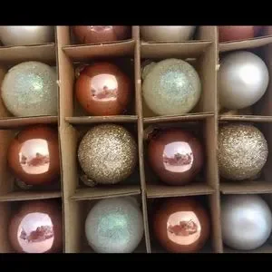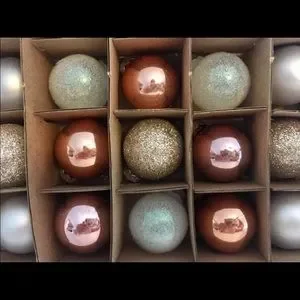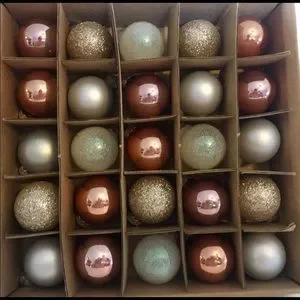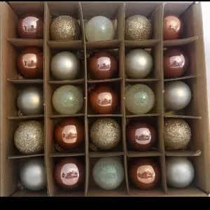 THIS IS A BRAND NEW SET OF 25 GLASS BALL ORNAMENTS BY WINTER DREAMS. THEY ARE BALLS IN SHADES OF ROSE GOLD, GOLD, MATTE SILVER, WHITE SOME SHINY AND OTHERS COVERED IN GLITTER . EACH ONE MEASURES ONE INCH IN DIAMETER .