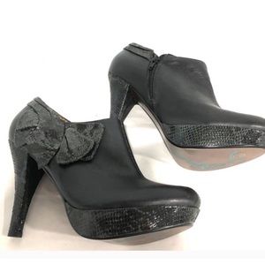 Excellent pre owned condition black leather with side shimmer bow / heels accents side zipper closure platform booties