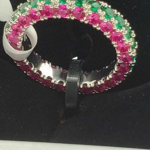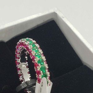 18k White Gold Plated ring 3 row eternity with pink and green cubic zirconia sto