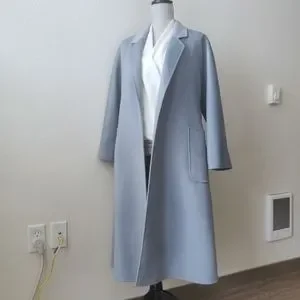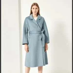 Pissenlit light blue wool cashmere coat. Features adjustable wrap front, tie belt, and signature wave pattern fabric.