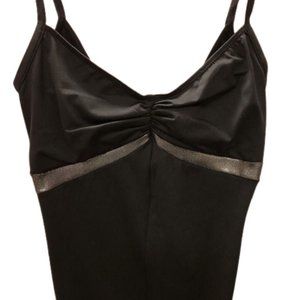 A classic cami leotard with silver/grey detail under the bust line. Front center seam, ruched front, medium V-back.