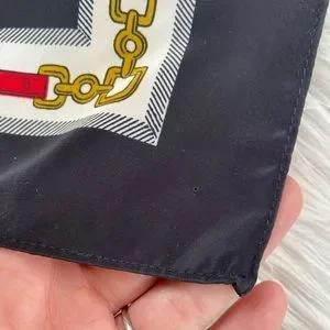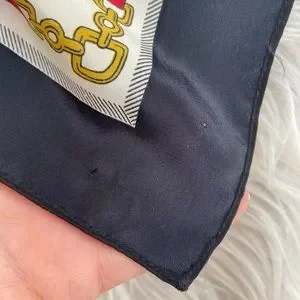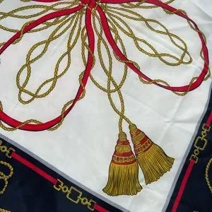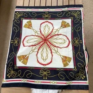 Black, Red, and Gold Tassel Horse Bit Scarf. Beautiful accessory scarf. No brand or material tags. There are a couple of holes where tags must have once been. Classic print. 34.5”x 34.5”