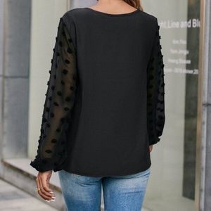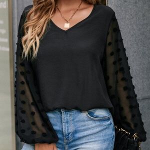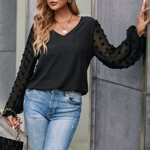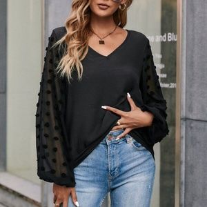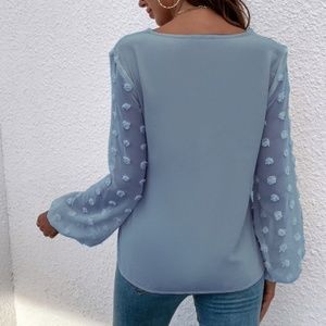 Boho Dusty Blue Swiss Dot Sheer Sleeve V neck Top Minimalist