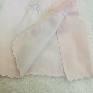 This gift set is a new item! 3 pieces, including embroidered baby blanket, embroidered 2 button top, and embroidered jacket. It is a lovely pale pinky peachy shade. A beautiful gift! Fabric is delicate but can be machine washed. So sweet! No tags, but it is new and unused.