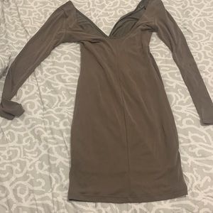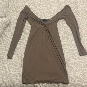 Worn. Taupe. Off the Shoulder Dress. Faux Wrap Front Dress. Brand Lac Blue. Brought at M Boutique square one.