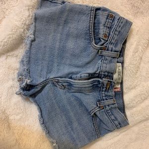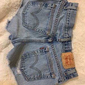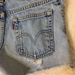 classic relaxed 550 tapered Levi’s jean shorts, light blue washed color. tight fitted and short, more on the worn side but no stains or markings. has small distressed hole on back of the right side.
