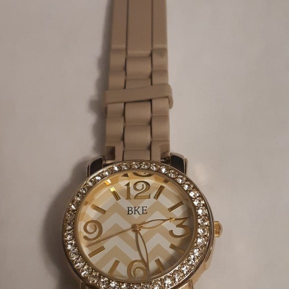 BKE watch, crystals on the bezel, quartz watch with a grey rubber strap. Normal wear and tear over the passage of time and regular use.
